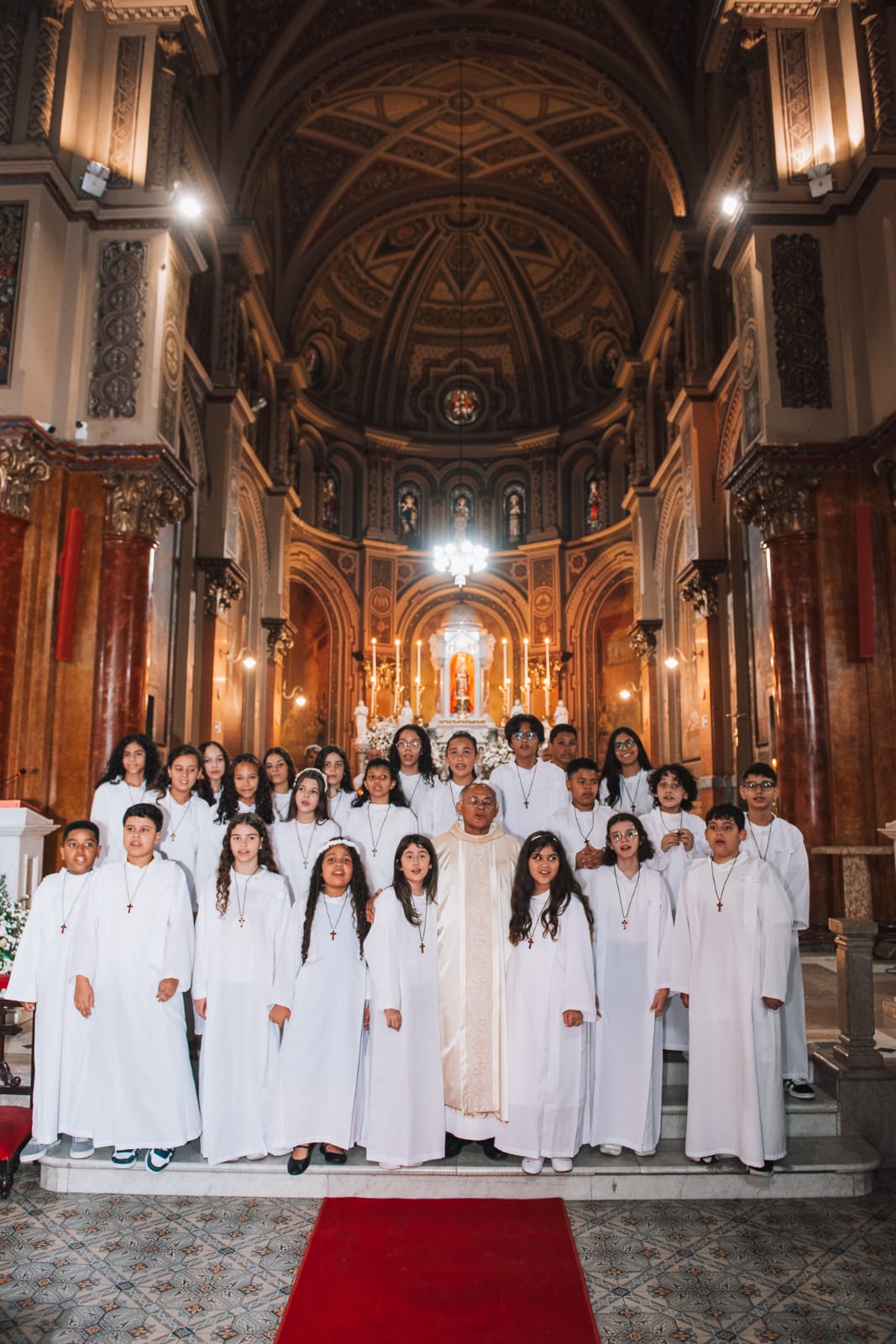No domingo, 20 de outubro, 24 crianças de nossa comunidade viveram um dos momentos mais significativos de suas jornadas de fé: a Primeira Eucaristia. A celebração foi marcada por intensa alegria e emoção, envolvendo todos os presentes em uma atmosfera de espiritualidade e gratidão.
