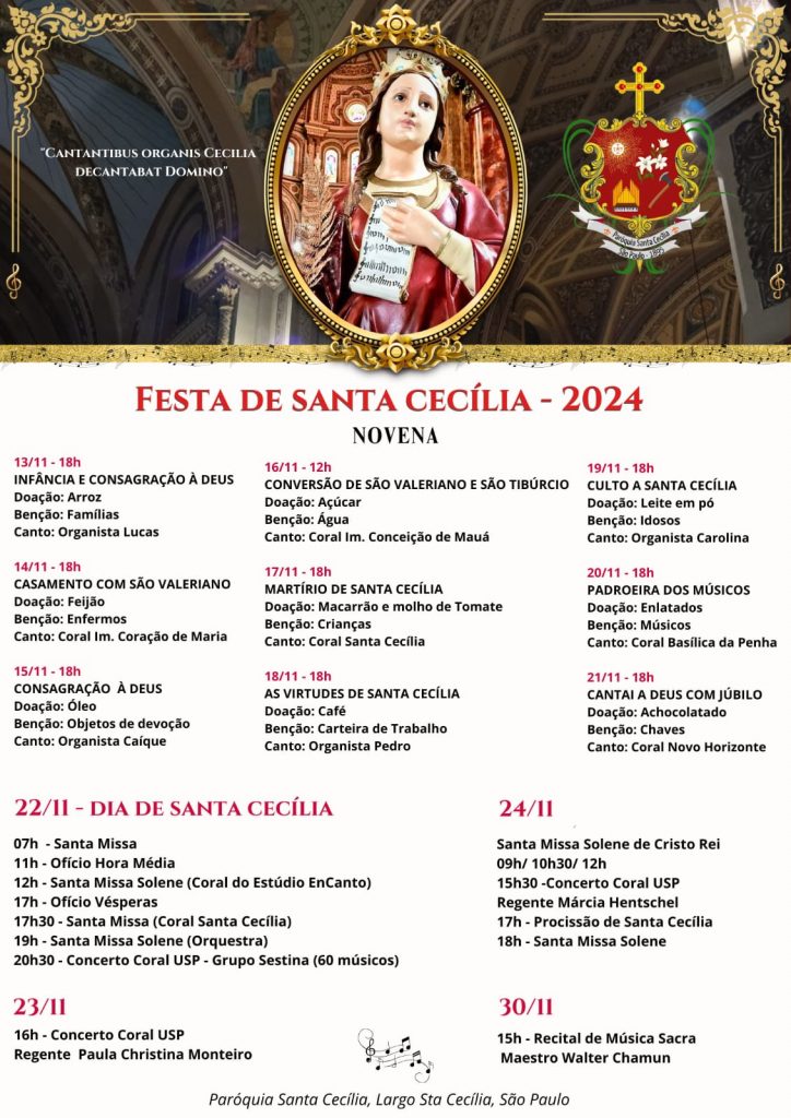 A Paróquia Santa Cecília, com profundo fervor e alegria, convida todos os fiéis para a celebração da Festa de Santa Cecília, padroeira dos músicos e exemplo de santidade, fé e serviço ao Senhor. Durante o mês de novembro, seremos conduzidos a uma intensa jornada espiritual por meio da novena, das missas, bênçãos e louvores, proclamando a presença viva de Deus em nossa comunidade. Que esta festa seja um convite para aprofundar nosso amor e nossa dedicação ao Pai, inspirados pelo testemunho de Santa Cecília.