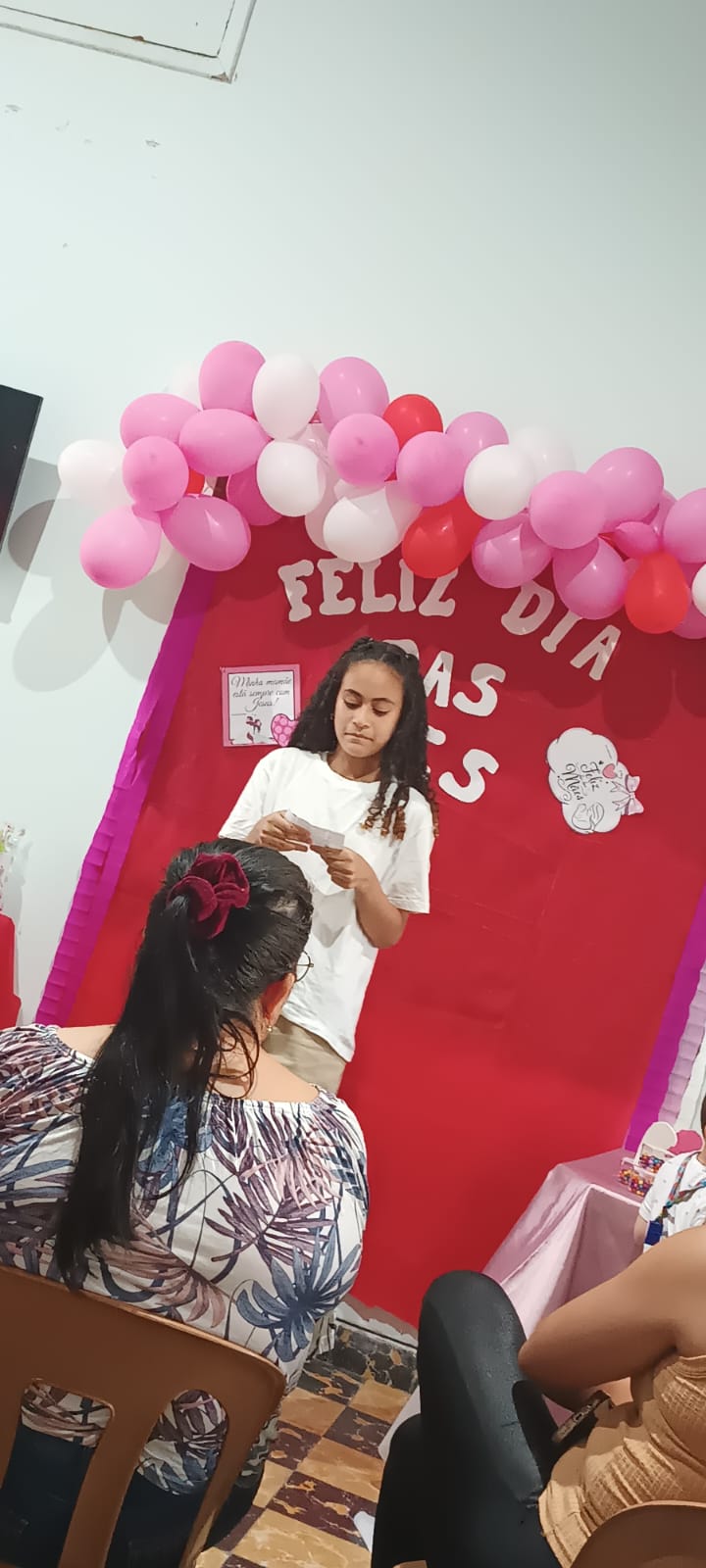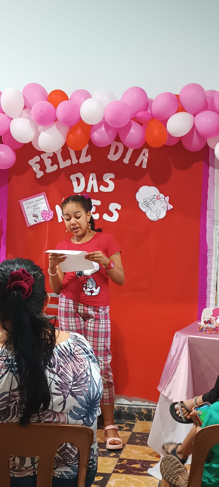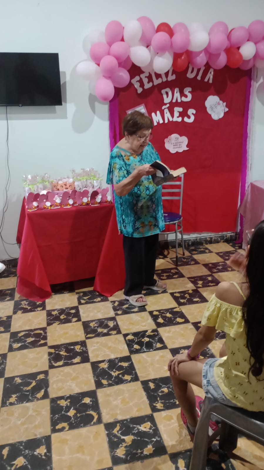 As crianças fizeram leituras com mensagens e homenagens para as mães. Teve uma criança que juntamente com seu pai confeccionou uma lembrancinha para darmos a todas mães.