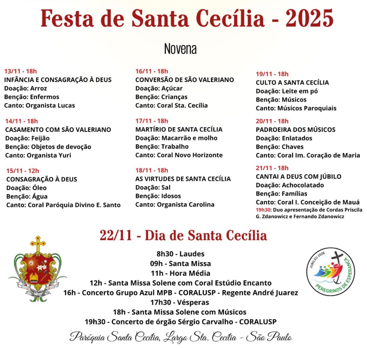 A comunidade é convidada a participar deste tempo especial de fé, música e devoção, celebrando o testemunho de Santa Cecília, modelo de amor a Cristo e de perseverança na fé.